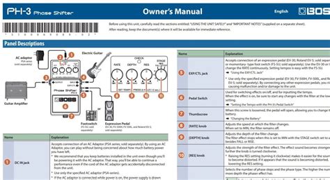 You can use the PH-3’s pedal to set the RATE to the tempo. This makes it easy to sync to songs (tempo and measure), formerly a difficult process. When set to MIN, the filter remains off. 9. DEPTH Knob Adjusts the depth of the filter change. The filter effect stops when this is set to MIN with the STAGE switch set to any- thing besides FALL or RISE. Concerning how to make the tempo set- tings, refer to steps 3 and 4 under “Setting the Tempo with the PH-3’s Pedal Switch” (p. 13). Simply substitute “FS-5U” where it says “PH-3’s pedal switch.”. As the battery is drained, the CHECK in- dicator dims, and the PH-3 may start to function incorrectly. Replace with a new battery (p. 17). Could the level of the sound being. Could the RATE knob be set to MIN. You cannot input the tempo with the external foot switch: Is the connector cord designed for stereo use. Have you connected a latch-type foot switch (such as the optional BOSS. We recommend that alkaline batteries be used when replacing the batteries.Used for instructions intended to alert the user to the risk of injury or material damage should the unit be used improperly. Other AC adaptors may use a different polarity, or be designed for a different voltage, so their use could result in damage, malfunction, or electric shock. Then install new batteries. To avoid inflammation of the skin, make sure that none of the battery discharge gets onto your hands or skin. FEDERAL COMMUNICATIONS COMMISSION RADIO FREQUENCY INTERFERENCE STATEMENT This equipment has been tested and found to comply with the limits for a Class B digital device, pursuant to Part 15 of the FCC Rules. Trademarks and Copyrights are property of their respective owners. Login Registration is disabled. We use cookies to ensure that we give you the best experience on our website. If you continue to use this site we will assume that you are happy with it. Ok.